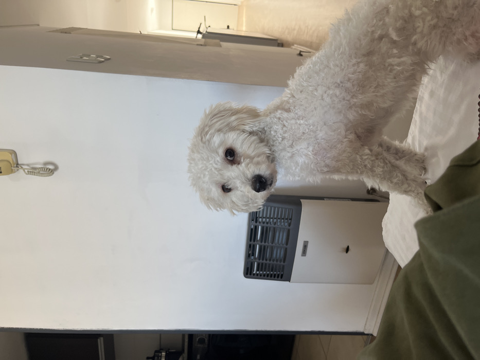 - "A white, curly-coated dog, resembling a Poodle or Bichon Frise type, stands on a white upholstered surface, looking directly forward with a slight head tilt to its left" by FM-CMArk2, licensed under CC BY 4.0