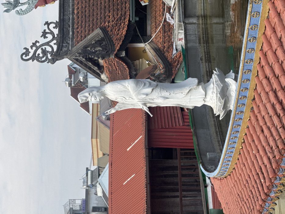 - "A weathered white statue of Guanyin, standing on a multi-tiered lotus pedestal within a rectangular, elevated pool of water, dominates the foreground in Xuân Thành, Vietnam" by FM-Oi8nu1, licensed under CC BY 4.0
