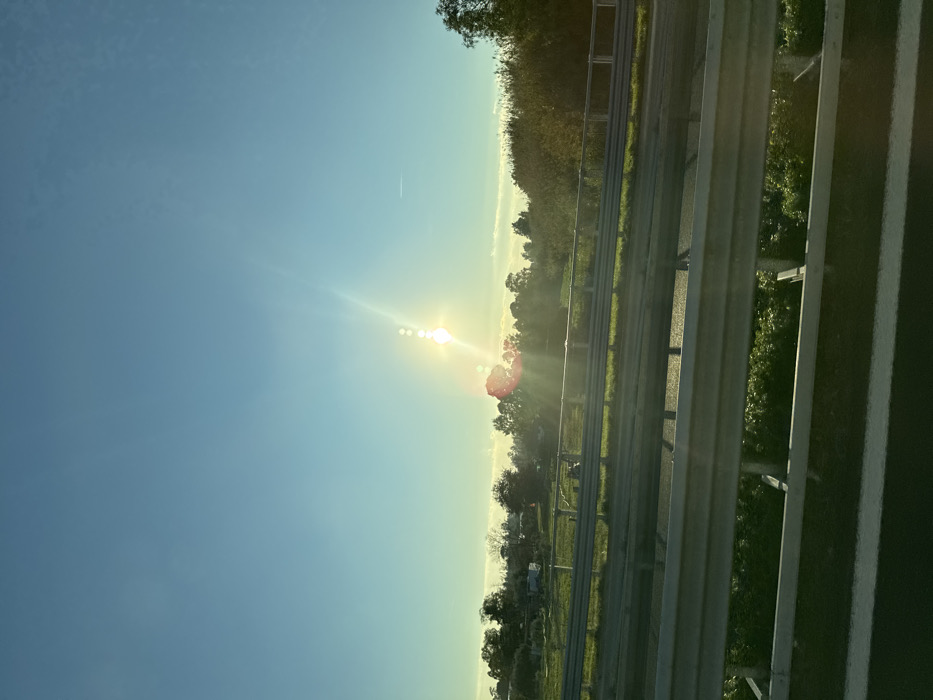 The image captures a sunlit, rural landscape, likely viewed from a roadway in Ladispoli, Italy. A low-angle sun, positioned centrally, dominates the upper half of the frame, emitting intense light rays and prominent lens flare across a clear, pale blue sky. A faint, white contrail from an aircraft is visible in the upper right. The foreground features a dark road surface at the bottom, above which two parallel, silver-colored metal guardrails extend horizontally. Behind these barriers, strips of vibrant green vegetation are visible. The midground consists of green fields or cultivated land dotted with trees and dense foliage forming a distant treeline. On the left side of the midground, several small, indistinct structures, possibly sheds or agricultural buildings, are present amidst the vegetation. No people, specific actions, or interactions are discernible.