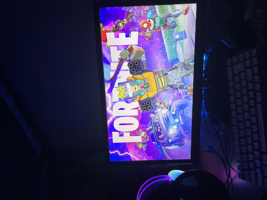 A monitor displays a vertically oriented Fortnite image with South Park characters