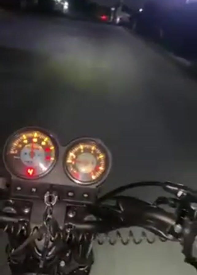 The video begins with a close-up of the speedometer and gauges of a motorcycle being driven at night
