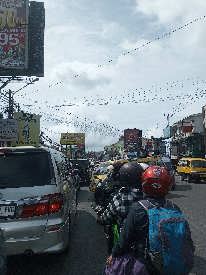 The image portrays a congested urban street scene under an overcast sky. Prominent signage in Indonesian, specifically mentioning "Cipanas" and "Sumba," indicates the location is in Indonesia, not Sandamal Eliya, Sri Lanka. In the immediate foreground, a silver Toyota Alphard minivan occupies the left side of the frame, displaying a partial license plate including "PVC." To its right, three individuals on motorcycles are positioned in a queue, facing away from the viewer. The nearest rider wears a red helmet, a dark jacket, a blue backpack, and a visible purple garment. The second rider wears a dark helmet and a black-and-white plaid shirt, mounted on a motorcycle with visible green accents. The third visible rider wears a light-colored helmet. The street extends into the background, revealing dense traffic consisting of numerous vehicles, including yellow vans (likely public transport) and various cars, all appearing stationary or moving very slowly. Multi-story commercial buildings line both sides of the street, adorned with numerous advertisements and billboards. Notable signs include a large billboard on the far left advertising "PROMO RUMAH" (house promotion) for "95 JT" (95 million IDR) and "Pineapple Garden," another sign for "HOTEL CIPANAS No. 45 CIPANAS," and a central yellow billboard reading "SALAM SUMBA." A dense network of overhead power lines and communication cables spans across the street against the backdrop of scattered white and gray clouds.