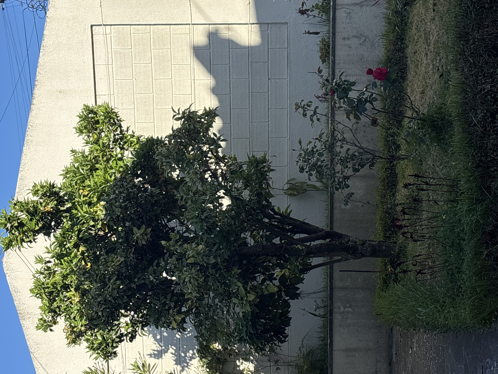 building corner in Lisbon, Portugal, with an orange tree in the foreground, its branches extending towards the viewer. The building wall behind the tree is white, with a rectangular inset pattern and tree shadows. To the right of the orange tree is a rose bush with one visible red rose. Tall grasses and other plants grow at the base of the bush. The ground slopes slightly away from the viewer. A concrete path is visible in the foreground. Electrical wires are visible against a patch of blue sky in the upper left corner of the image.