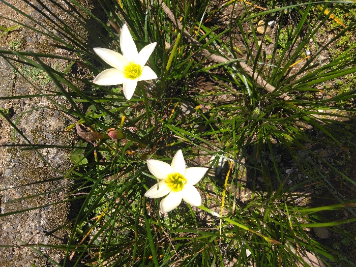 - "This image captures a close-up, high-angle view of two blooming white flowers with prominent yellow centers, set against a backdrop of dense green grass and a textured concrete or stone surface, observed in Phouviang-Gnai, Laos" by FM-oHfK92, licensed under CC BY 4.0