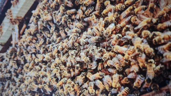 The image displays a dense aggregation of numerous honey bees (Apis mellifera) covering the majority of the frame. Thousands of individual bees, characterized by their segmented, light brown and black striped abdomens, are tightly packed, with some heads and antennae visible. Faint, blurred wooden structures, consistent with parts of a beehive frame or box, are partially visible along the upper and right edges of the composition. The bees appear to be either stationary or moving minimally within this dense cluster. No human subjects or specific interactions are discernible. The immediate environment is internal to a beehive or a similar apiary structure. The image exhibits noticeable vertical banding artifacts, indicative of a photograph taken of a digital screen display. This scene is located in Nahariyya, Israel.