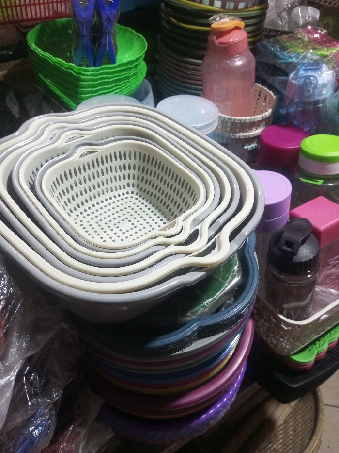 A stack of nested, square-shaped colanders dominates the image. The colanders are varying shades of gray and white. Beneath them is a stack of colorful, similar shaped dishes. To the right are various plastic containers and bottles with colorful lids, and a basket holding a water bottle. A stack of green plastic dishes are near the top left of the image. A tall stack of dark plates is situated behind the green dishes.