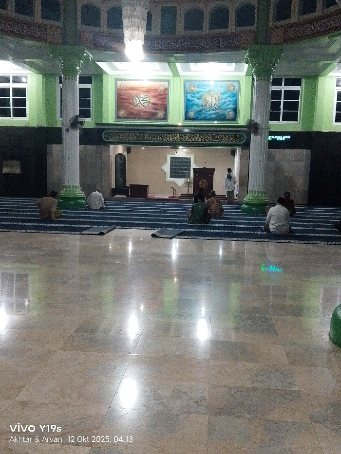 The image depicts the interior of a mosque in Jagapura Lor, Indonesia, at approximately 04:13 on October 12, 2025
