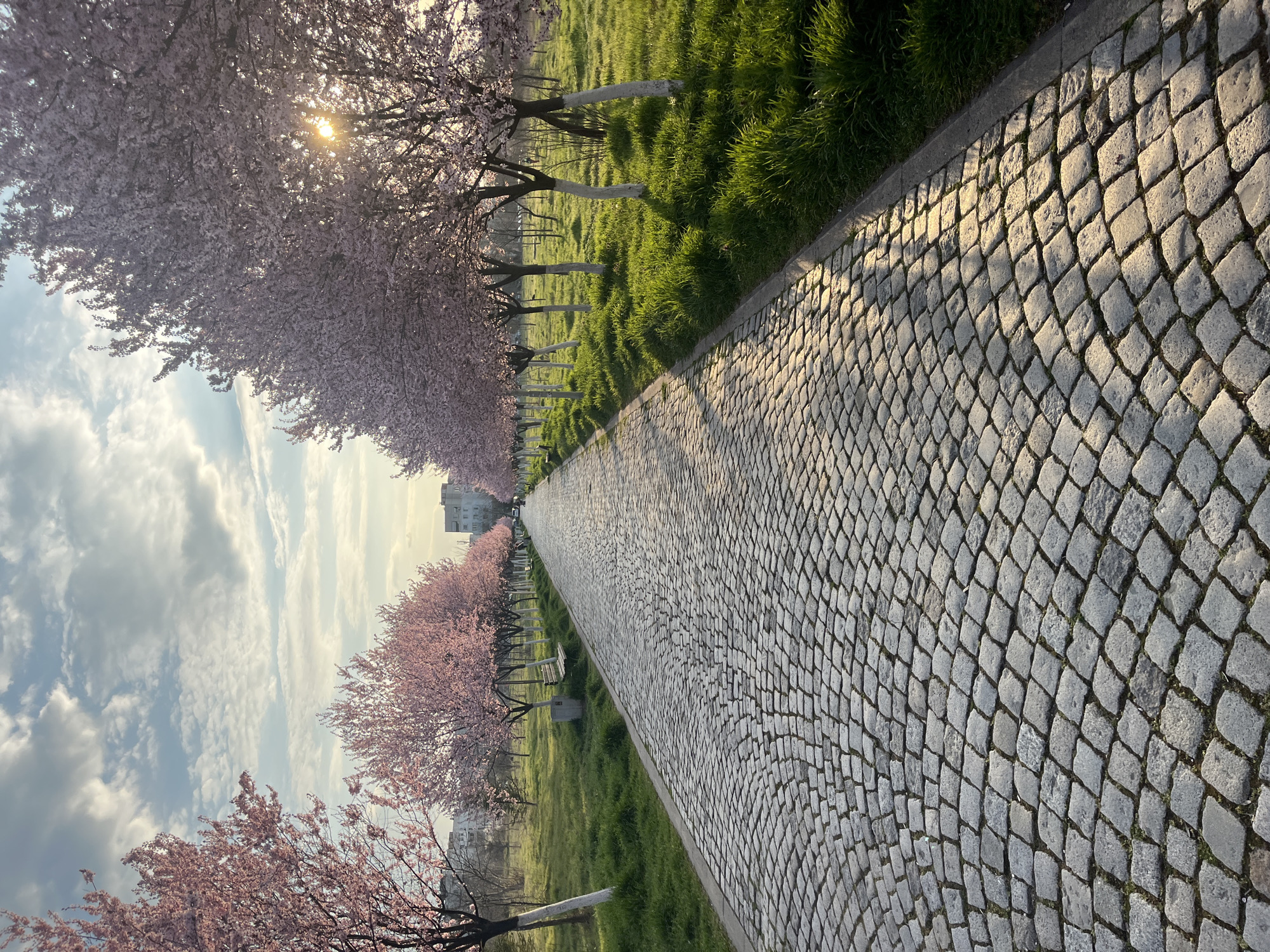 The image presents a straight, tree-lined cobblestone pathway within an urban park setting in Plovdiv, Bulgaria. The pathway is constructed from grey, irregularly shaped cobblestones arranged in an interlocking, fanning pattern, extending linearly from the foreground into the distant background. Two parallel rows of trees, exhibiting profuse pink blossoms, flank the pathway; their lower trunks are painted white. To the left and right of the cobblestone path, areas of vibrant green grass are visible, suggesting parkland. Scattered along the left side of the path, beneath the trees, are multiple wooden park benches and dark grey refuse bins. The sky above is partially cloudy, featuring a blend of blue and white stratocumulus formations. The sun is positioned low on the right side of the frame, partially obscured by the blossoming trees, casting a warm, golden light and elongated shadows diagonally across the cobblestone surface. This illumination indicates either early morning or late afternoon. In the extreme background, beyond the trees, several multi-story residential buildings with light-colored facades are discernible, confirming the urban environment. No individuals are clearly identifiable within the scene.