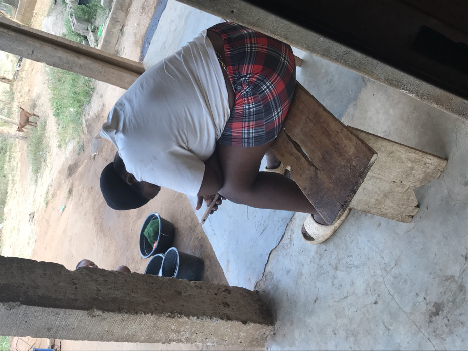 A person wearing a white t-shirt and plaid shorts sits on a rough, wooden stool. They are leaning forward, possibly looking at a mobile phone in their hands. Three black buckets are near the person. Outside, a brown animal walks on the grass. The scene appears to be an outdoor area, possibly a porch, with a concrete floor and weathered walls.