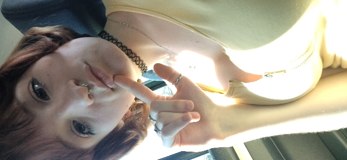 The image features an individual with reddish-brown hair and bangs, possessing light-colored eyes and a silver septum piercing, facing the viewer. They are wearing a light-colored, front-zippered garment, a black choker necklace, and a thin silver chain. The individual's right hand is raised, with the index finger positioned against their lower lip or chin. Multiple rings are visible on the fingers of the right hand, including a silver band on the thumb. The background suggests an indoor environment, possibly a vehicle interior, with blurred elements and strong natural light originating from the right side of the frame, causing significant highlights and overexposure on the lower right portion of the subject's body and clothing. The specific location within the city of Goričani, Montenegro, is not ascertainable from the visual content of the image.
