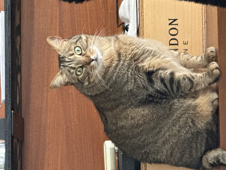 - "A brown and grey tabby cat with prominent green eyes and white whiskers is seated upright, facing directly towards the viewer" by FM-8JC2m2, licensed under CC BY 4.0