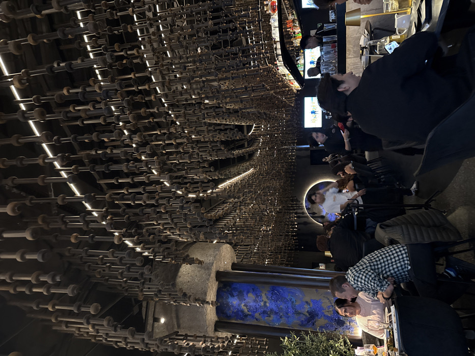 crowded interior space with unique ceiling decor. The ceiling is adorned with numerous rod-like structures featuring cylindrical elements. Below the ceiling, people are seated at tables and a bar area. The lighting creates patterns in the ceiling. The atmosphere suggests a social gathering or dining establishment. One table features a large stone-like pillar with a design visible within.