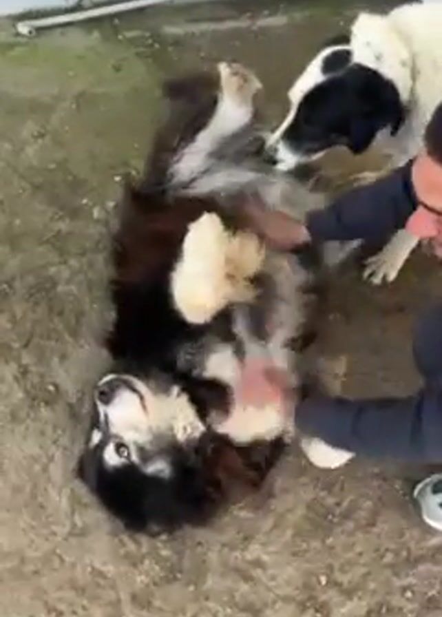 man on the ground playfully scratching the belly of a large, fluffy dog with black, white, and brown fur. The dog is lying on its back, enjoying the attention. A second, primarily white dog is standing in the background, licking its mouth. The scene takes place outdoors on a dirt or concrete surface, with a partially visible wall or structure in the background. The man is wearing dark clothing and white sneakers.