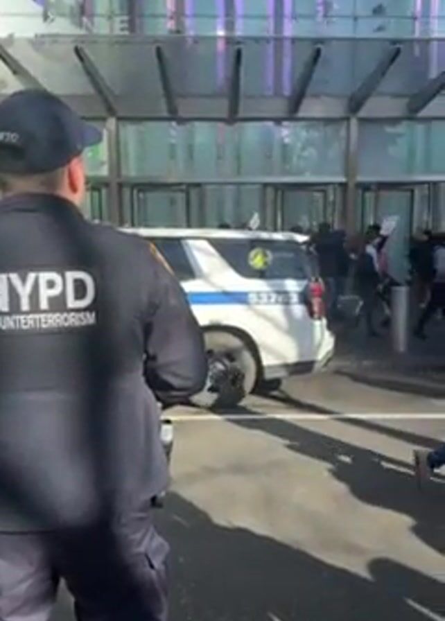 group of people protesting in front of a building. An NYPD Counterterrorism officer stands in the foreground, watching the protestors. A police vehicle is parked nearby. The protesters are holding signs, including one that reads "NO TROOPS IN OUR CITIES!". The person holding the red sign is holding it up over his head. The building in the background has glass doors. The protestors move through the doors.