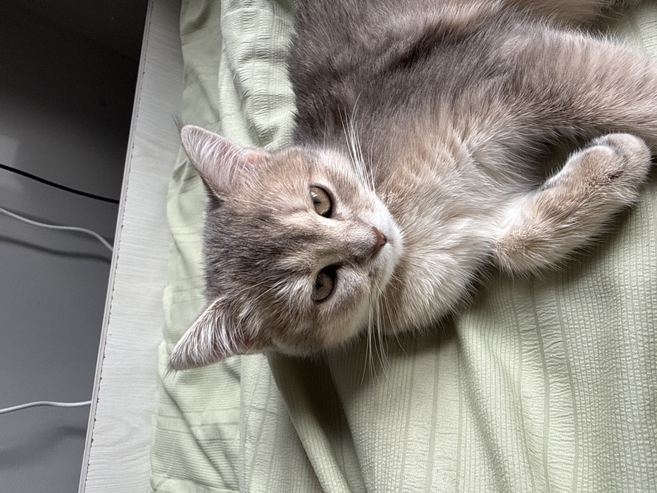 - "A domestic cat, displaying a diluted tabby pattern with light grey-brown fur and cream-colored underparts and paws, is depicted lying on a light green, horizontally textured fabric, likely a blanket or bed sheet" by FM-zShZ92, licensed under CC BY 4.0