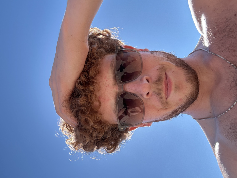 This is an upward-angle, close-up outdoor portrait of a young adult male, likely captured in Tel Aviv, Israel, under a clear blue sky. The subject possesses reddish-brown curly hair, a light beard, and is wearing dark-framed sunglasses. His right hand is placed on top of his head, fingers slightly spread into his hair. He is bare-chested, revealing a thin, silver-colored chain necklace. The background consists solely of a bright, unblemished blue sky, indicating strong sunlight, which backlights the subject's hair and shoulders, creating a halo effect. Reflections visible in the sunglasses suggest a wide-open, light-colored environment, consistent with a beach or coastal area. The subject displays a neutral to slightly smiling expression.