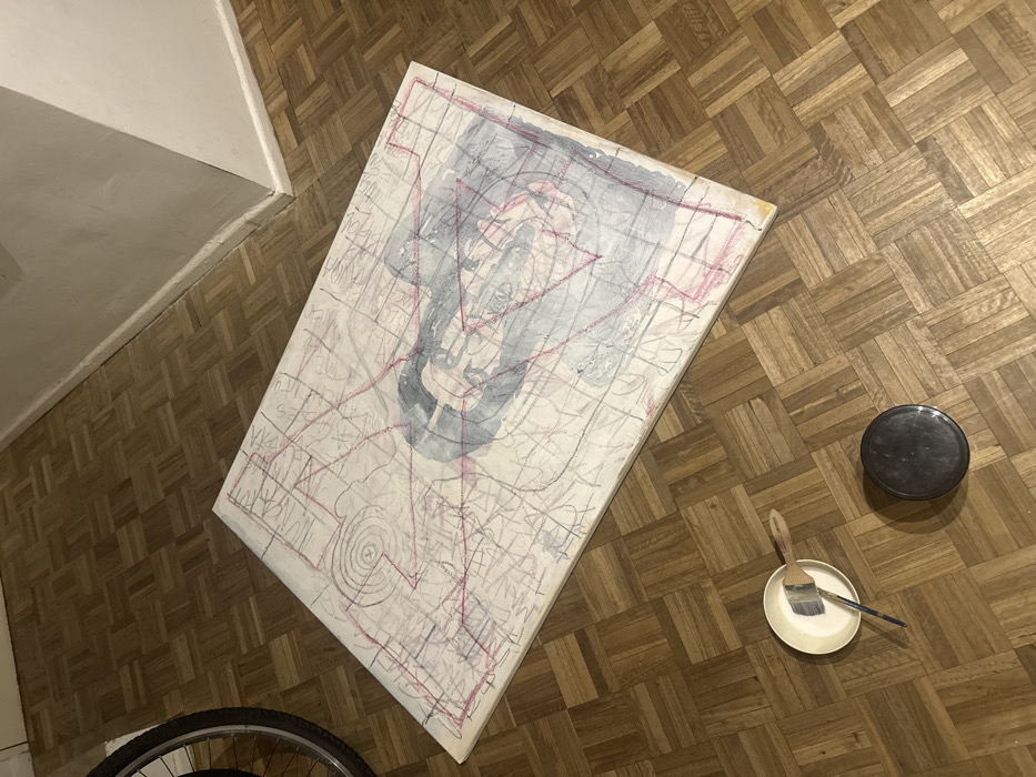A canvas with an unfinished mixed media artwork lies on a parquet floor. The artwork features a central abstract gray figure, overlaid with a grid of red and gray lines, and scribbled text. Nearby, a round black container sits beside a small dish containing brushes and paint. A section of a bicycle tire is visible in the lower left corner, next to the wall.