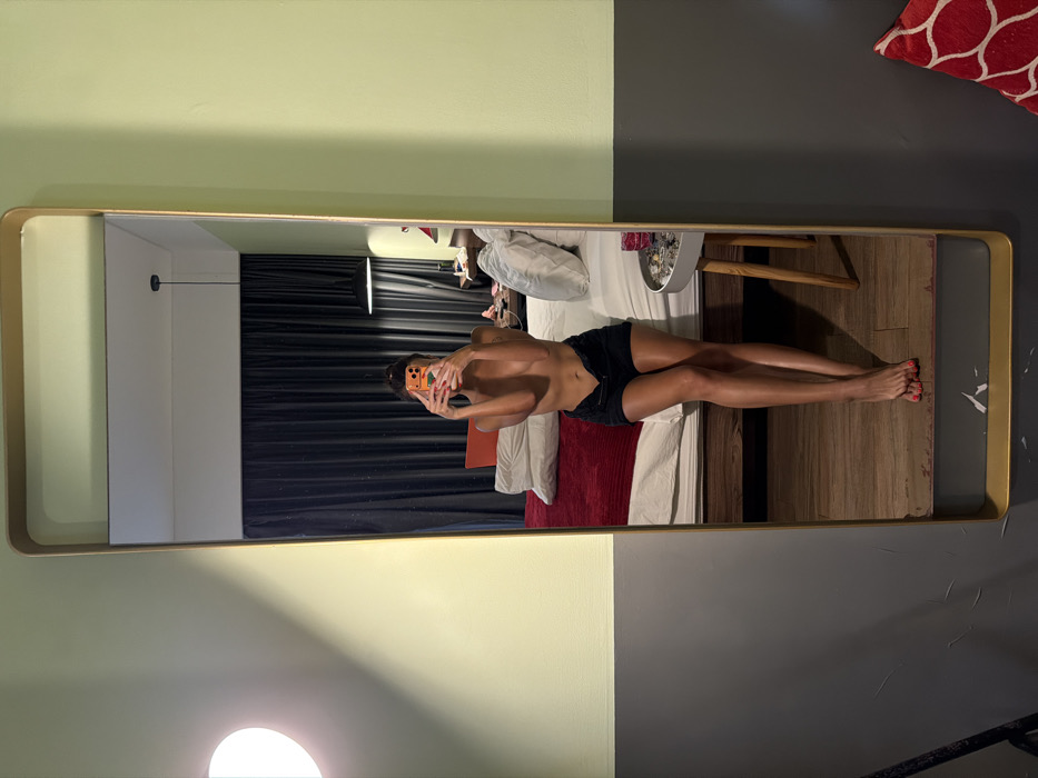 A female is depicted taking a mirror selfie in a hotel room in Canggu, Indonesia. The image shows a full-length mirror with a gold-toned, rounded rectangular frame, leaning against a two-toned wall. The wall is painted light green on the upper section and dark gray on the lower section. A circular white wall sconce with a warm glow is affixed to the light green wall, to the left of the mirror. Reflected in the mirror is a female, visible from her mid-chest to her bare feet. She is topless and wears black shorts. Her face is obscured by a smartphone, held with both hands, positioned to capture her reflection. Her hair is styled in a bun or top knot, and her toenails are painted red. She is seated on the edge of a bed, facing the mirror, with her legs crossed at the ankles. The reflected environment behind her is a hotel bedroom. The bed has a dark wooden frame and is dressed with a white fitted sheet, a prominent red duvet or blanket, and several white pillows. Dark, heavy curtains, possibly black or dark gray, cover the wall behind the bed. A black pendant lamp hangs from the white ceiling above the right side of the bed. A small, round, three-legged wooden bedside table is positioned to the right of the bed, holding a pink/red glass container and other small, indistinct items. The floor visible in the reflection is wooden. In the immediate foreground, outside the mirror's frame, the wooden floor shows some wear, and a red and white patterned cushion is partially visible in the bottom right corner.