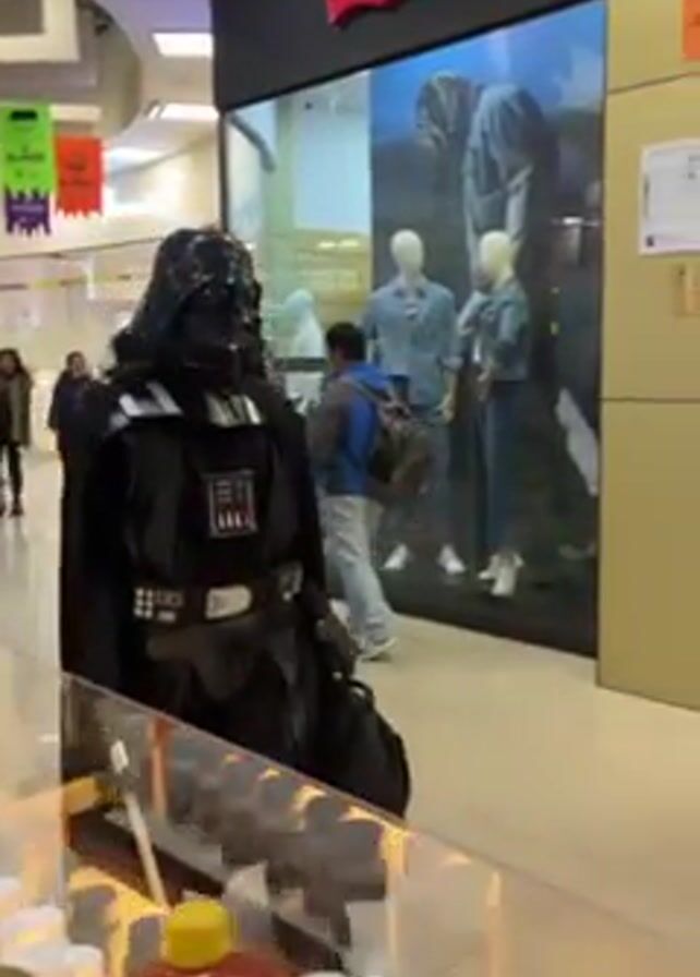 A person wearing a Darth Vader costume is seen walking through a shopping mall