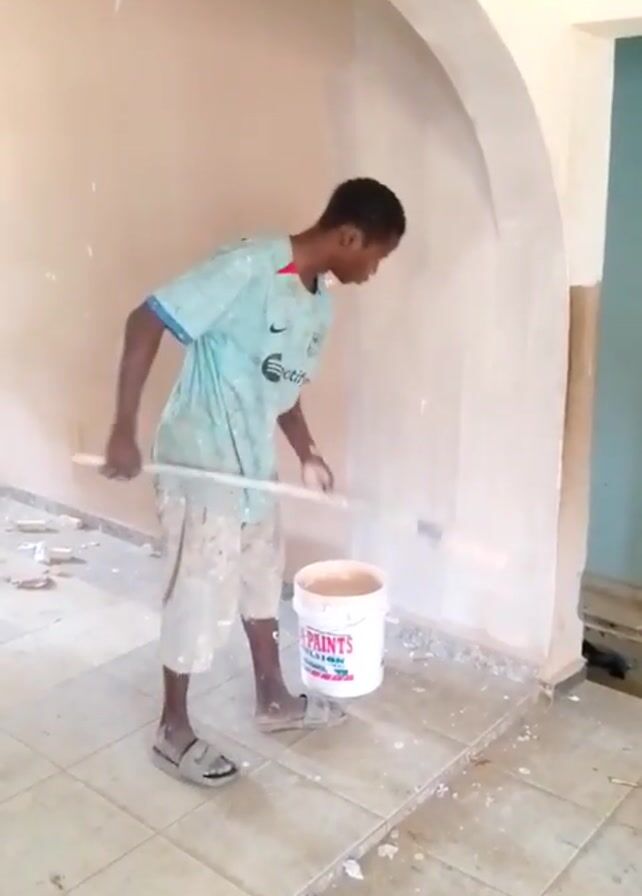 young man painting a wall in what appears to be an indoor space. He's wearing a light blue t-shirt, beige shorts, and sandals. He is using a paint roller attached to a long wooden handle to apply paint to the wall. A white bucket labeled "PAINTS" sits on the tiled floor near him. The wall is light beige. There's an arched doorway behind the wall he is painting. Debris is scattered on the floor. The room is well-lit. The video is taken from a static position.
