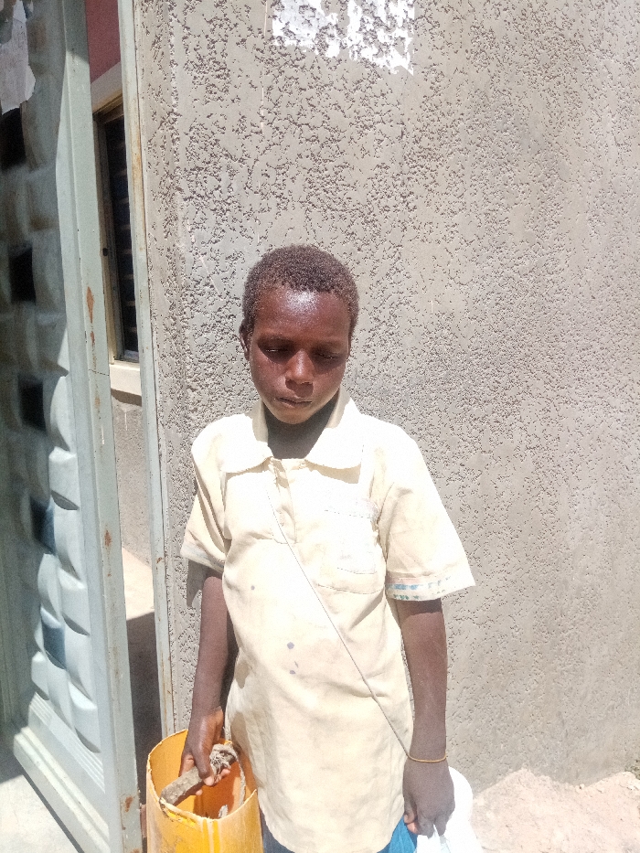 The image depicts a young male standing outdoors in Dabawa, Nigeria. He has dark skin, short, dark, curly hair, and his eyes are closed or heavily downcast. His forehead and cheeks appear shiny. He wears a light-colored, possibly beige, short-sleeved polo shirt, which exhibits stains and a worn condition. A thin, light-colored string extends diagonally across his chest. A thin, gold-colored bracelet is present on his right wrist. In his left hand, he holds a yellow plastic bucket containing a dark, unidentifiable object. His right hand grips a crumpled white material, likely fabric or plastic. The background features a rough, textured light gray stucco wall. To the subject's left, a partially open white metal door with a geometric relief pattern is visible, revealing a dark interior. Above and to the left of the door, a segment of a reddish-brown wall and a dark-framed window are discernable. The scene is brightly illuminated by natural light.