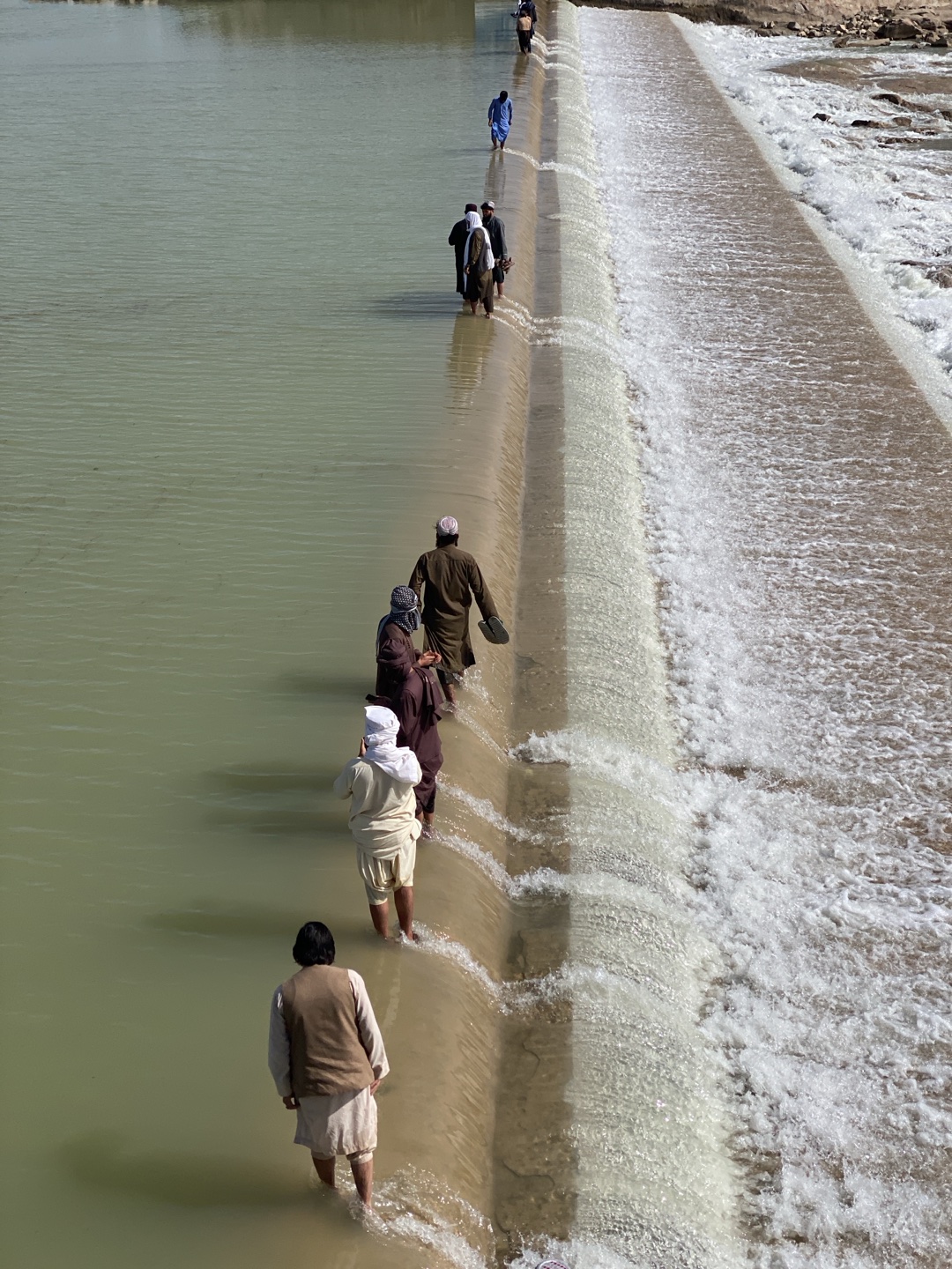 The image depicts a group of people walking across a concrete dam or weir in a river or large stream. The water appears murky and light brown in color. People: * There are at least nine individuals visible. * They are dressed in traditional Afghan clothing, including long shirts, vests, and head coverings (turbans or skullcaps). * Most are walking barefoot or with their feet in the water that is flowing over the dam. Objects: * A long concrete dam or weir spans the width of the waterway. * Water is flowing over the edge of the structure. * The far bank appears to be sandy or rocky. Actions: * The people are walking across the dam in a single line. Environment: * The scene is outdoors in daylight. * The landscape appears arid or semi-arid. * The location is unspecified, but the prompt suggests it may be near Kim, Afghanistan.