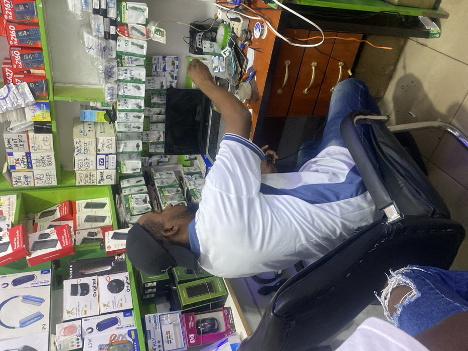 The image displays an interior view of an electronics repair and sales shop in Kaduna South, Nigeria