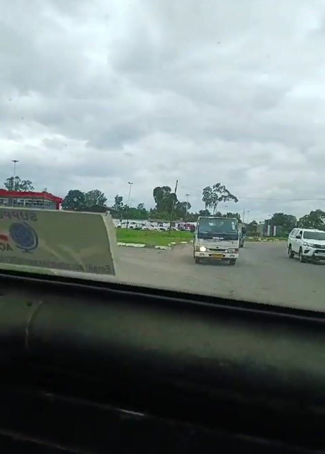 A video filmed from inside a car driving through a town on a cloudy day. The road is paved and has other cars and vans traveling on it. On the left side of the road is a grass area with a large red and white building, possibly a shopping center or store. A sign is visible indicating it is Union Hardware. The inside of the car is somewhat visible. The speaker says that Zimbabwe is full of friendly people.