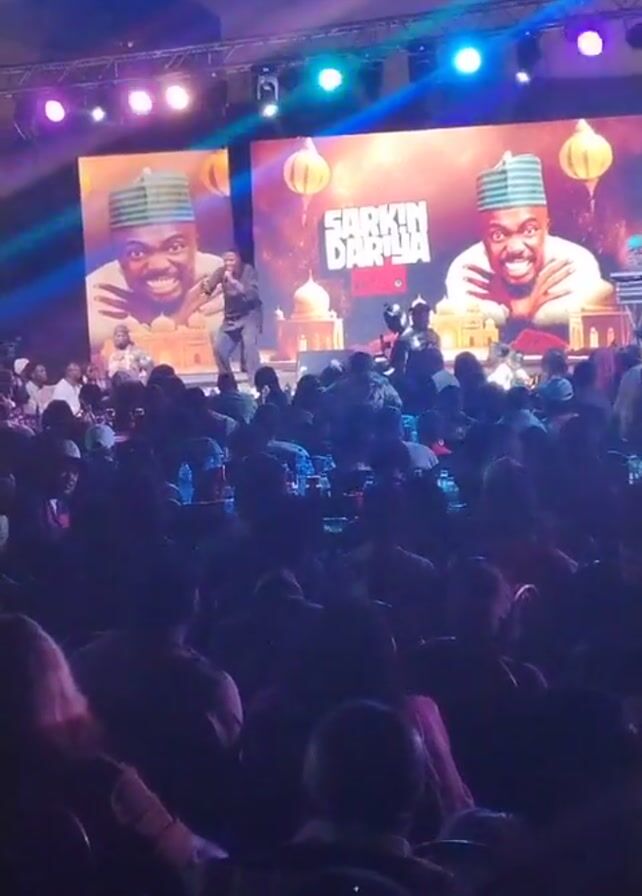 A live performance is taking place indoors in a large, crowded venue. An individual in a dark suit is on stage, holding a microphone and speaking. Two large screens behind him display the same image, featuring a smiling man wearing a hat, with the words "SARKIN DARIYA" above him. The lighting is a mix of blues, yellows, and purples. The audience sits at tables.