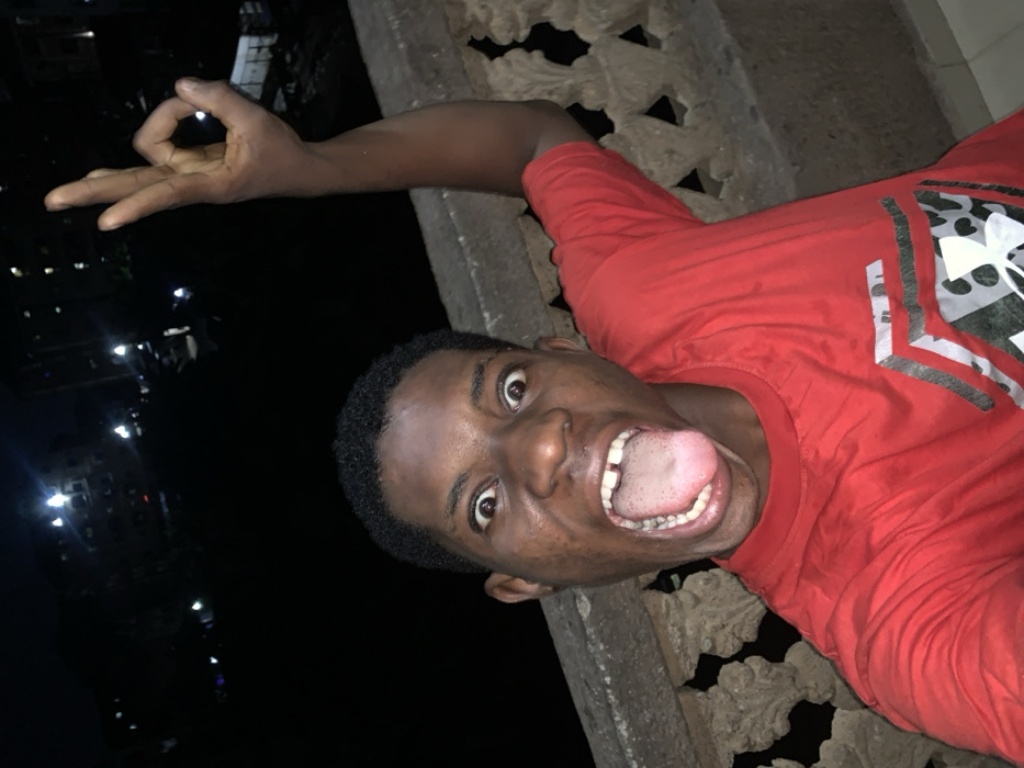 A young man in a red shirt poses, sticking out his tongue and making an "OK" sign with his hand. He's positioned on a stone ledge or balcony with patterned cutouts. The background reveals a dark night with city lights visible in the distance. His expression is exaggerated and playful.