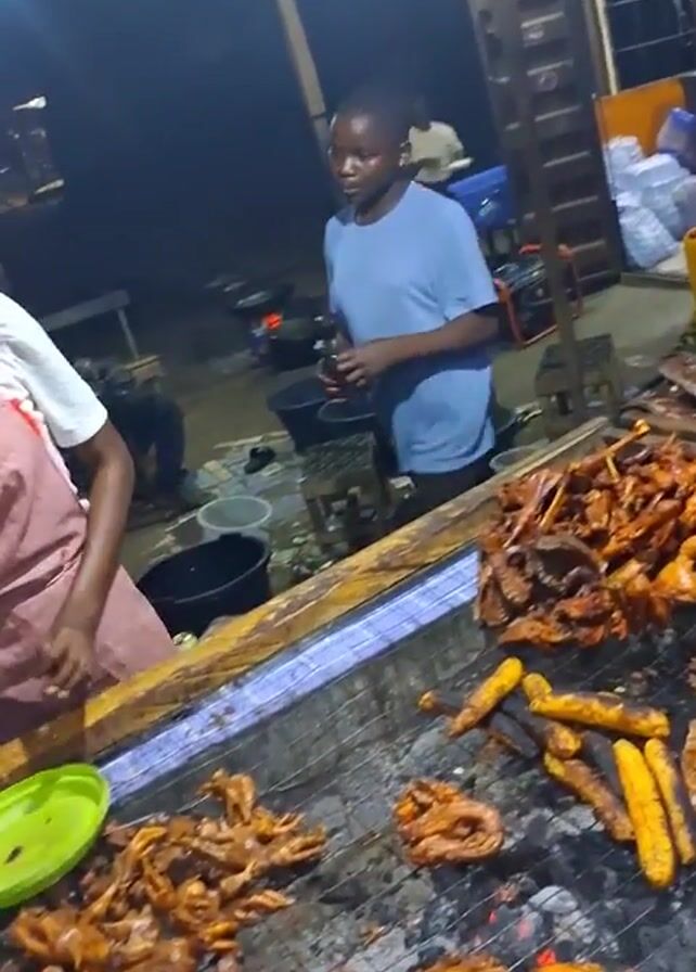 food stall at night, where a woman wearing a pink apron and headscarf is selling grilled food. The grill contains various pieces of meat and plantains, cooked over charcoal. Another person in a blue shirt is also visible behind the grill. A man in a white shirt is paying the woman for his order, which she is packing into a bag. There are several black pots and containers in the background, possibly used for cooking or storage. The area seems to be lit by artificial lights, and there are other people sitting and standing around.