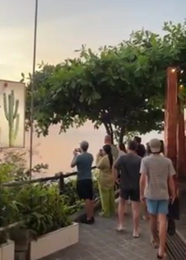 A group of people stand on a stone patio, looking out at a vista on the horizon. Several of them are taking pictures with their phones. A woman in white shorts and a black tank top walks past the camera. There are some plants and trees visible, as well as a sign with a cactus on it. The sky is a pale color, suggesting it is near sunset or sunrise.