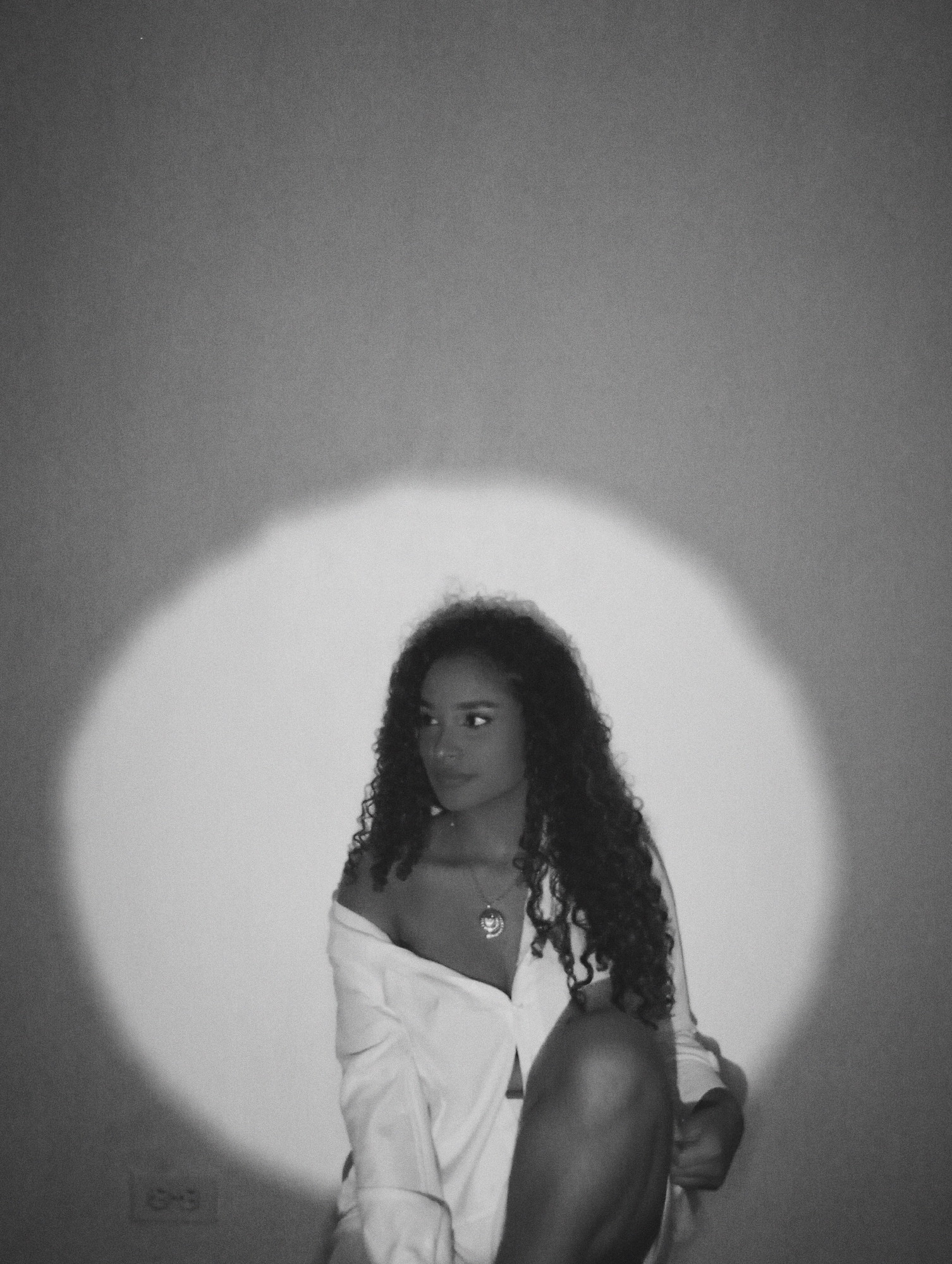 A black and white medium shot depicts a woman with long, curly hair, seated in front of a light-colored wall, with a large circular spot of light behind her. She is wearing a white, open-collared shirt that is partially off her left shoulder. A necklace with a round pendant is visible on her chest. Her left leg is drawn up, and she appears to be holding it with her right hand. The location is unknown.