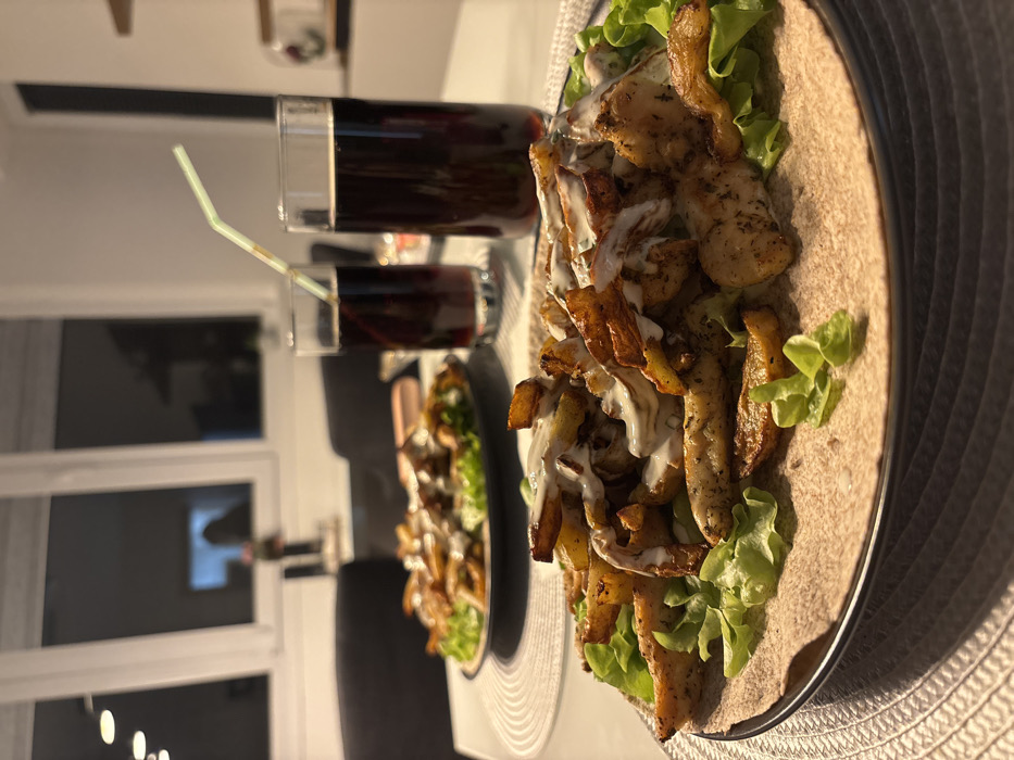 The image depicts an indoor dining scene at night in Gabrovo, Bulgaria. In the foreground, a dark-rimmed plate rests on a white circular woven placemat, presenting a meal. The plate holds a large flatbread or tortilla, topped with green leaf lettuce, seasoned, diced chicken pieces, and rustic cut potato wedges, all generously drizzled with a white, creamy sauce. To the right of this plate, two tall, clear glasses filled with a dark, carbonated beverage are visible. The left glass contains a light green, bent plastic straw. In the midground, another identical plate of the same meal is visible, out of focus, positioned behind the foreground plate. The background features a large multi-pane window reflecting interior light and a blurred silhouette of a person. Interior walls are light-colored, and artificial lighting illuminates the room. Blurred dark furniture, possibly chairs and a table, are also present in the background. No individuals are clearly visible or performing distinct actions within the frame.