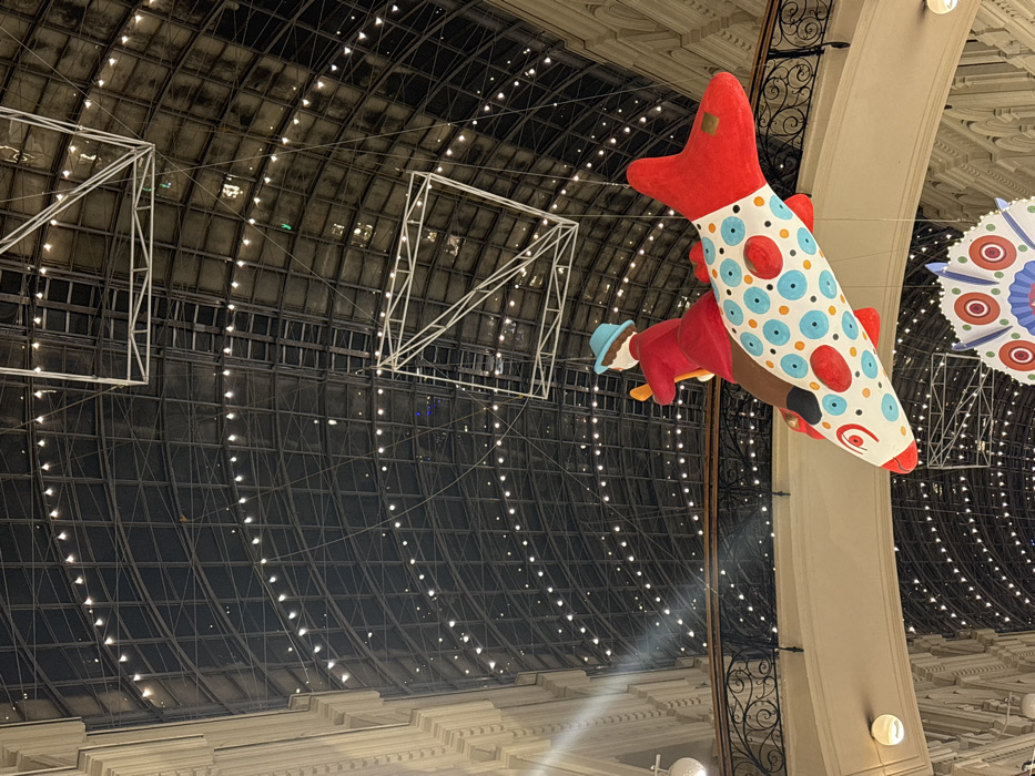 A whimsical, colorful mobile hangs suspended in an ornate interior space. The mobile features a red-and-white rocket-shaped figure adorned with blue and orange polka dots. A small, red-suited figure wearing a blue hat rides the rocket. A large, arched ceiling with rows of lights defines the space, with square, white-framed structures adding architectural interest. The foreground shows a decorative, light-colored column with intricate black wrought-iron details.