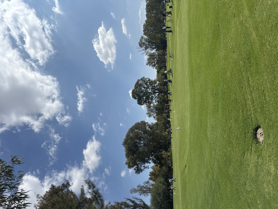 A sunny day with a blue sky speckled with fluffy white clouds. The horizon is lined with trees, behind which a golf course stretches out with short green grass. Golfers are spaced along the fairway, apparently practicing their swings. Small white flags mark distances on the course. A drain or access point is visible in the foreground.