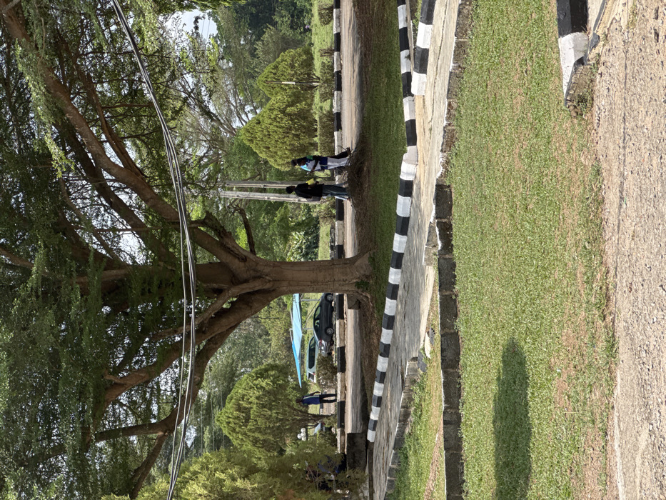This image depicts an outdoor scene in Osu, Nigeria, centered around a large, mature tree with a wide green canopy and exposed roots at its base. In the immediate foreground, a neatly mown lawn is bordered by concrete curbs painted in alternating black and white segments, with a curved concrete pathway segmenting the grassy area. In the midground, beneath the large tree, three individuals are standing on a dirt patch. The leftmost person wears a dark top and trousers and carries a backpack. The middle person wears a light-colored top and dark trousers. The rightmost person wears a light top with dark accents and dark trousers. They appear to be engaged in conversation. Above them, multiple dark utility lines or cables traverse the frame horizontally. To the left of the main tree, in the background, a white SUV and a dark-colored sedan are parked beneath a light blue tarp-like structure, possibly a temporary car canopy. A fourth individual, dressed in a dark blue shirt and dark trousers, stands near the white SUV. The background features additional smaller, conical evergreen trees and dense foliage, indicating a well-landscaped area. Utility poles are also visible behind the large tree. The scene is illuminated by bright daylight, casting visible shadows on the foreground grass.