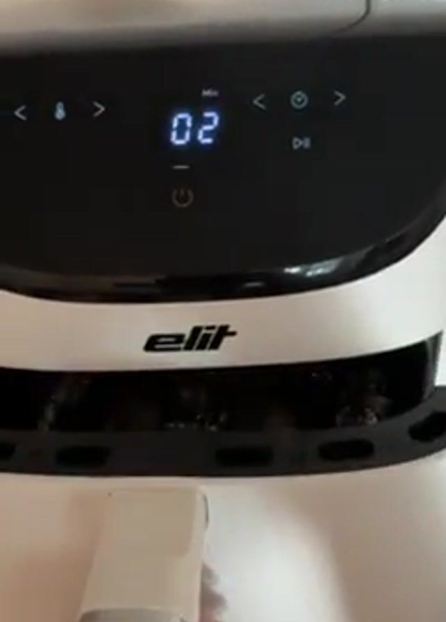 n Elit air fryer being opened. Inside the air fryer basket, there are two items wrapped in aluminum foil. The person in the video opens the air fryer by pulling the handle. The air fryer has a digital display showing the number "02" and various icons. The air fryer is white with a black top. The person's hand is visible, with dark-colored nails.