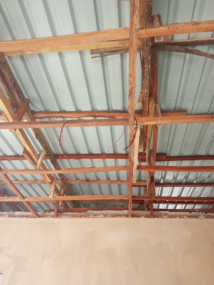 A cluttered interior shot reveals a wooden framework supporting a corrugated metal roof. Thin wooden beams are arranged in a grid pattern, intersecting with thicker, upright wooden supports. A red wire is haphazardly strung across the beams. Below the roof structure, a light-colored wall stretches across the frame's bottom, indicating the interior space. The image highlights the rustic and exposed construction of the building.