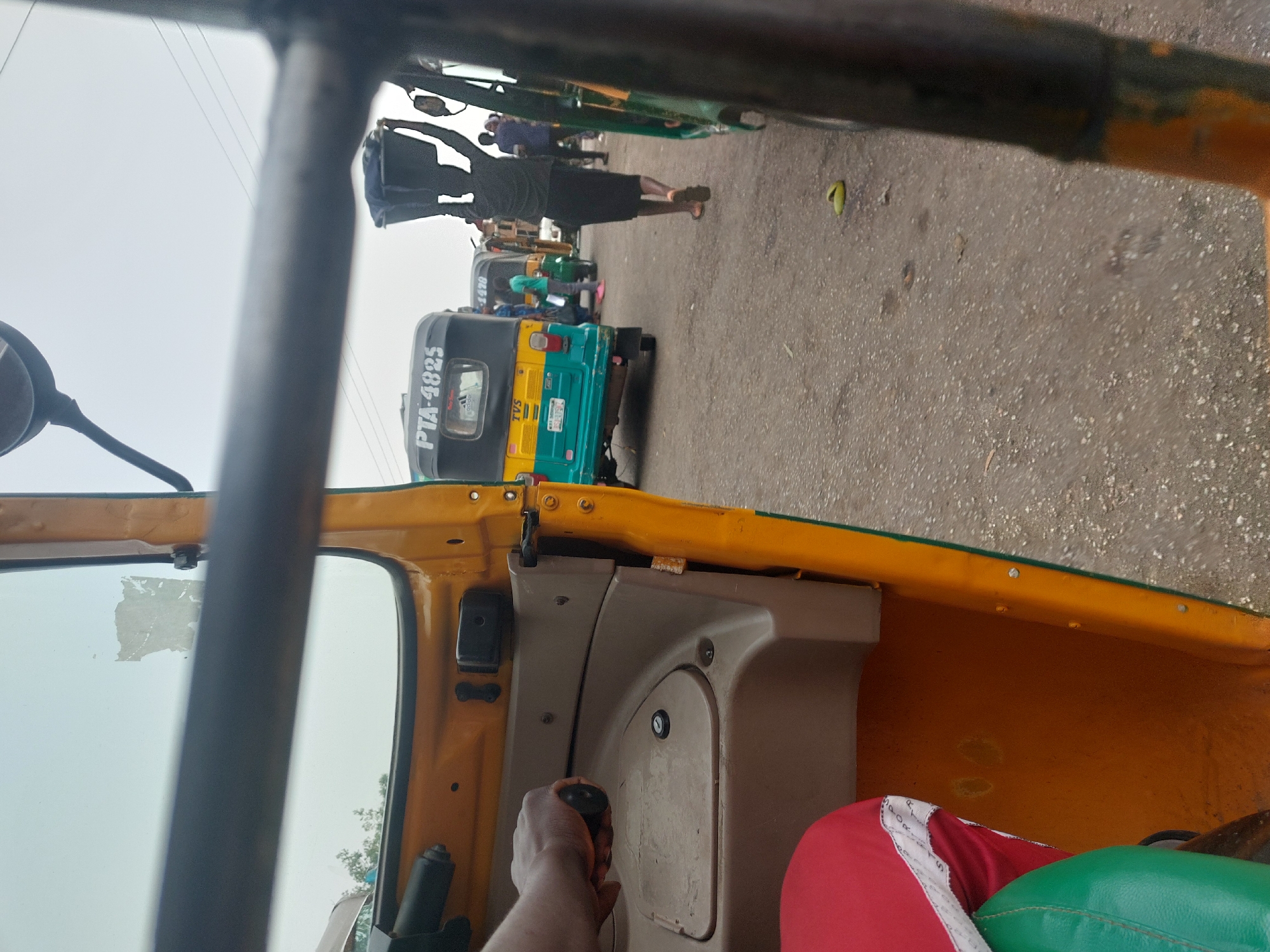 interior of a yellow and orange auto rickshaw, looking out onto a street scene. The vehicle's frame obscures part of the view. Outside, on the asphalt road, there are other auto rickshaws, including one that is blue and yellow with the license plate "PTA-4825". A person in dark clothing and sandals is walking along the side of the road. The hand of the driver is visible inside the rickshaw. The overall setting appears to be a street in a city, possibly Jos, Nigeria, based on the style of vehicle and environment.