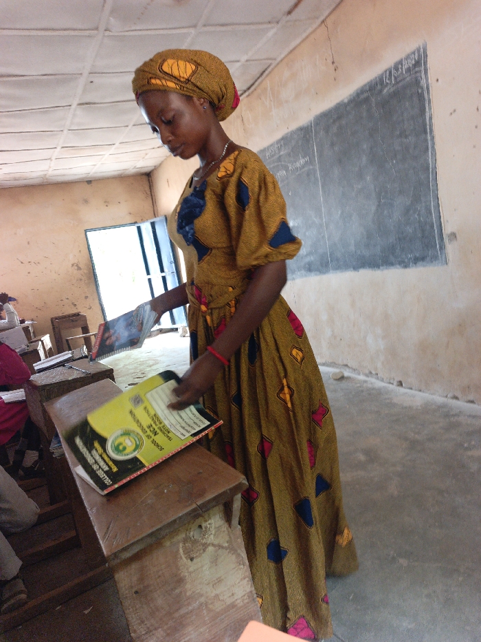 A female individual stands in what is identified as a classroom within the College of Education, Akwanga, Nasarawa State, Nigeria