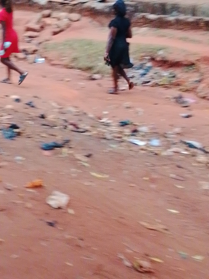 The image displays an unpaved, reddish-brown dirt path in Ukwu-Abwa, Nigeria. Two individuals, both adult females, are depicted in motion. The individual on the left, partially visible, wears a red garment and dark sneakers, moving from right to left across the frame. The individual on the right wears a black short-sleeved dress and light-colored sandals, also moving from right to left, and appears to carry an object in her left hand. The ground is littered with assorted debris, including plastic items and paper. In the background, a reddish-brown dirt embankment with sparse green vegetation is visible.