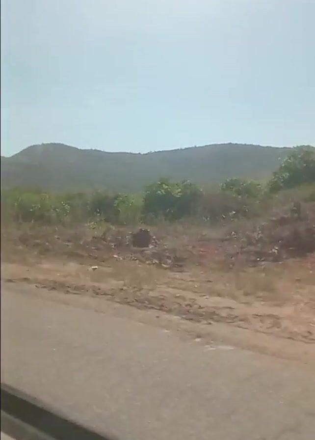 The camera is looking out of the side window of a moving car. The car is traveling on a paved road beside a stretch of dry, overgrown land. In the distance, a low mountain range is visible under a clear blue sky. The sun is bright, and some lens flare is visible. The scenery is mostly dry vegetation.