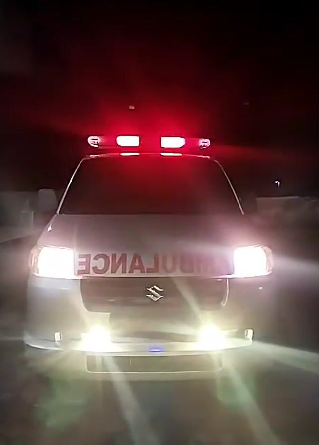 An ambulance with flashing red lights on top and headlights on is shown at night. The word "AMBULANCE" is written on the front of the vehicle, backward. The ambulance is white and has a Suzuki logo on the front. The background is dark.