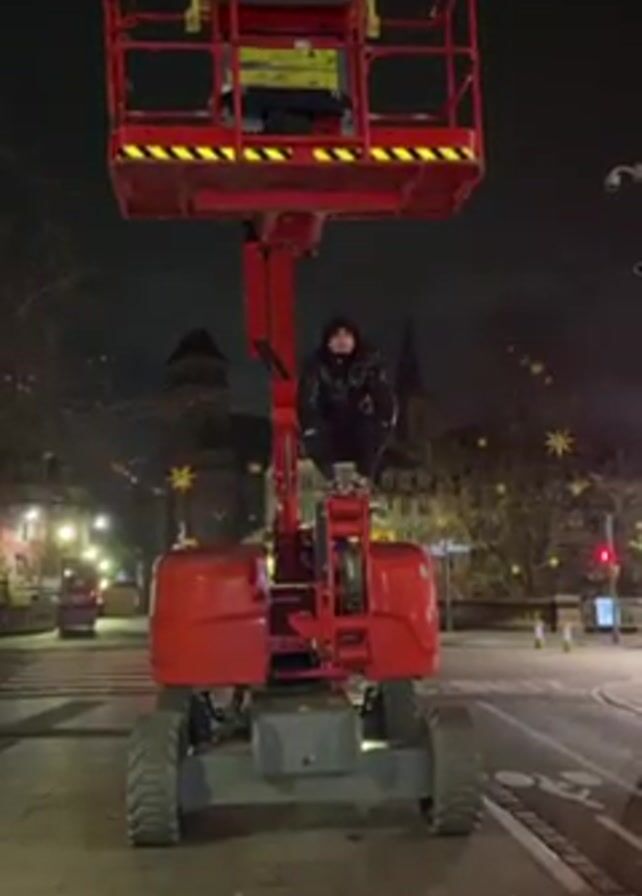 A young man is crouched atop the central machinery portion of a stationary, red aerial lift on a city street at night. The lift’s platform is raised. The man wears a black, puffy jacket, dark pants, and black-and-white sneakers. The city street is lined with bare trees and holiday-style star lights. Buildings are visible in the background, one with a tall steeple. A bus or trolley passes in the background. The man looks toward the camera and smiles.