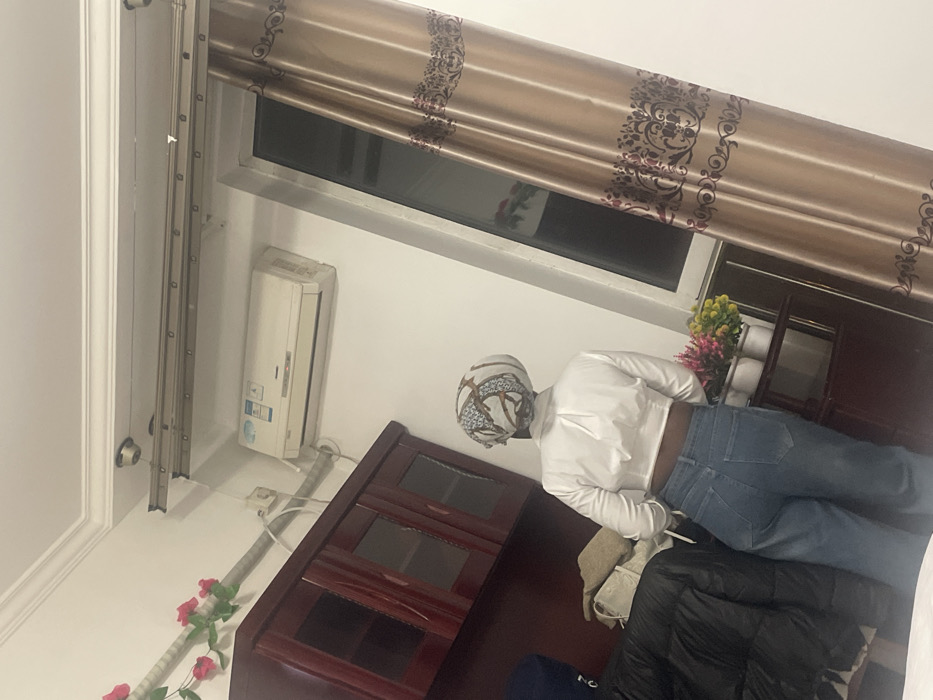 An interior scene is depicted within a room in Changping District, China, under artificial lighting. A single individual, seen from behind, occupies the center-left. This person is wearing a white, long-sleeved, cropped shirt, blue jeans, and a white patterned head covering featuring brown and blue designs. They are standing upright, facing towards a large window on the right side of the frame. The room features white walls with crown molding near the ceiling. On the left, a dark wooden cabinet with two glass-fronted doors is visible. Resting on or near this cabinet are a black puffy jacket and light-colored folded textiles. Above the cabinet, a white conduit adorned with artificial red roses runs horizontally along the wall. High on the wall, above the window, a white split-unit air conditioner unit with Chinese characters is mounted. Below it, a white electrical outlet with visible wiring is present. Near the ceiling, a metal clothes drying rack system, consisting of two parallel bars with integrated hooks, is installed. The window on the right is partially obscured by a brown, satin-like curtain with dark patterned embroidery. On a small dark stand positioned below the window, three white pots contain colorful artificial floral arrangements in shades of pink, purple, yellow, and orange. The view through the window is dark, suggesting evening or night.