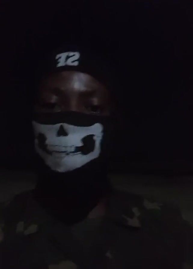 A person wearing a black beanie with a white "SE" inscription, a black mask with a white skull print, and a camouflage jacket is facing the camera in a dark environment. The person's eyes are visible above the mask. The video is slightly out of focus and blurry. There is music in the background. The person moves their head slightly.
