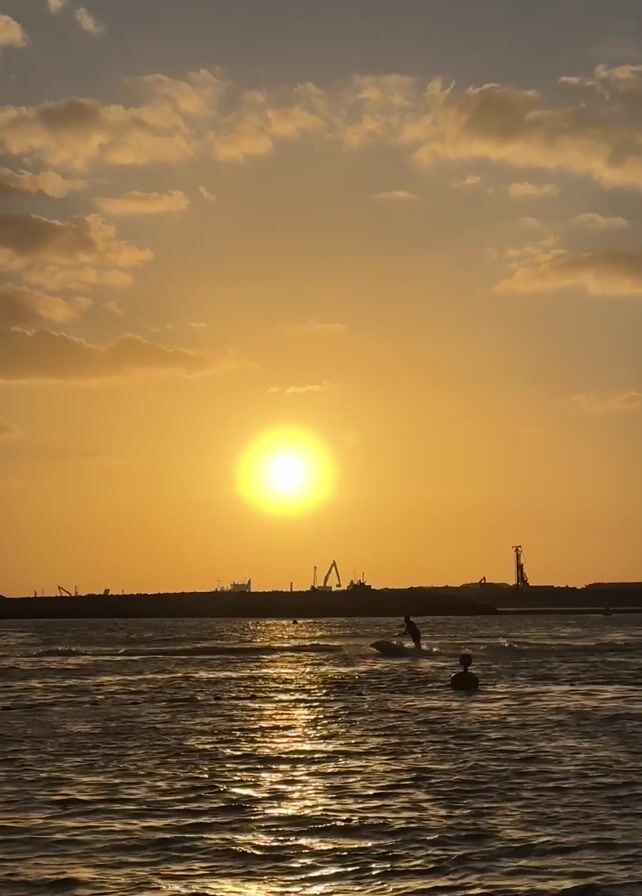 A person is riding a jet ski in the ocean at sunset. A second person is swimming in the water nearby. The sun is a bright orange orb in the sky, casting a golden glow over the water and clouds. The sky is a mix of orange, yellow, and light blue. Silhouetted against the sunset are industrial structures like cranes and docks, situated along the distant shore. The water is choppy, with the setting sun reflecting on the surface.