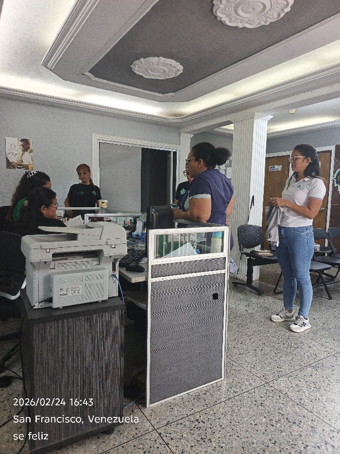 The image depicts an indoor scene within an office or commercial space in San Francisco, Venezuela, on February 24, 2026, at 16:43