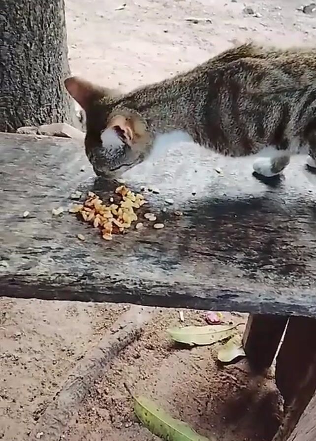 A gray tabby cat eats a pile of food, presumably rice and meat, from a wooden surface. A person’s hand briefly enters the frame and spreads what appears to be chili sauce over the food. The cat continues eating. The surface is a plank table, and the ground below is dirt with some leaves. A tree trunk is visible in the background.